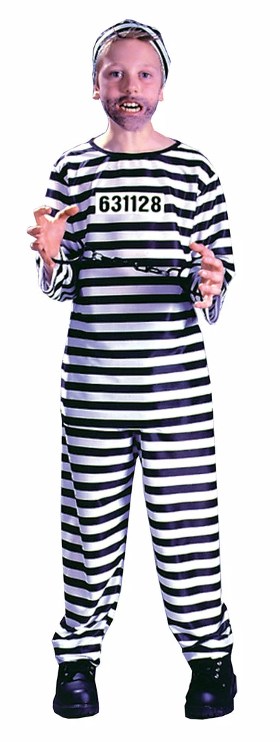 Striped shirt with convict number, striped pants, and, convict hat. Shackles not included.