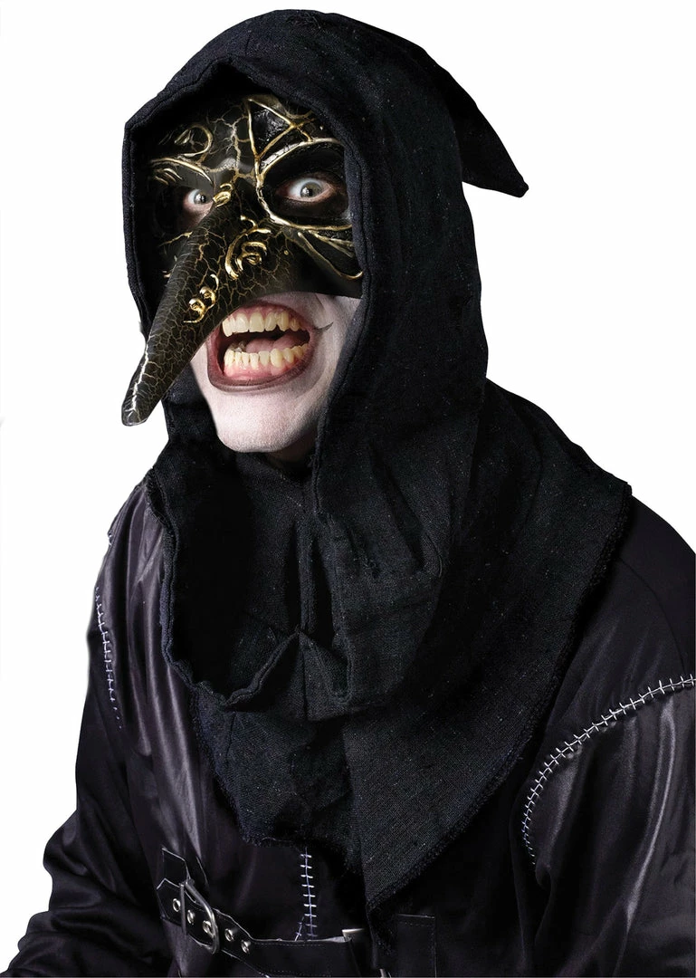 Masks in this style are common during Venice’s Carnivale, but ours has a menacing, antiqued-look scary appearance. Comes with attached hood.