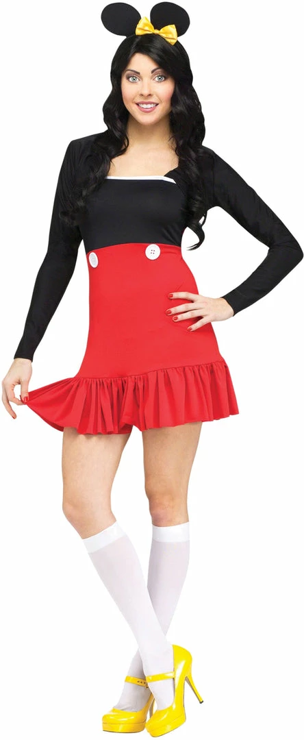 A sexy new version of your favortie mouse! Mini dress with black top and red skirt, black shrug, and mouse ears headband. Shoes and socks not included.