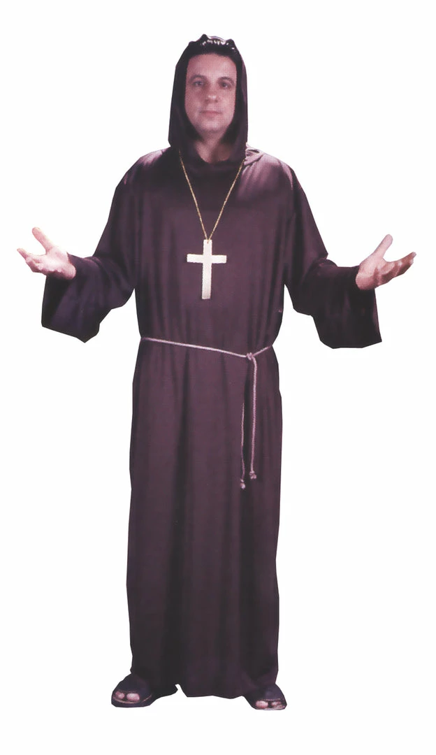 This traditional robe has matching hood with tie front closure and rope belt. One size fits most, up to 5’11, 200 lbs. Measures about 55 inches from shoulder to hem. Cross and sandals not included. 100% polyester. Brown.