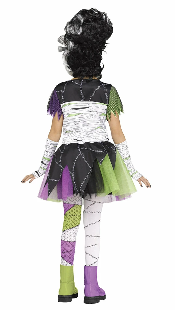 size monster bride costume includes stitched look dress, matching sleevelets, bolt headband, choker and footless tights.