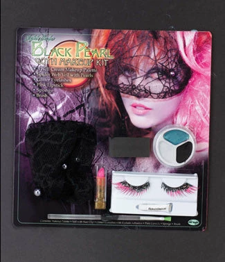 Goth Makeup kit includes spider web veil with pearls, eyelashes, eyelash adhesive and pink lipstick.