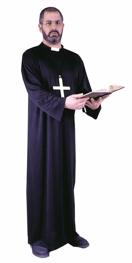 Lightweight black cassock with attached white collar. Fits, up to 195 lbs. Polyester. Cross not included.