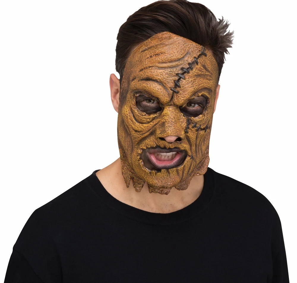 This creepy scarecrow is what nightmares and horrors are made of. Scare more than just the crows when you transform into a terrifying scare crow character. The Adult Scare Crow Skinned Mask features a terrifying brown half mask with wrinkles and faux stiches. The mask has an elastic band that goes around the back of head. One size fits most adults. This is a costume accessory. Not a toy.