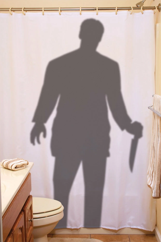 White shower curtain with shadowy figure showing up holding a knife. 70 in X 72 In