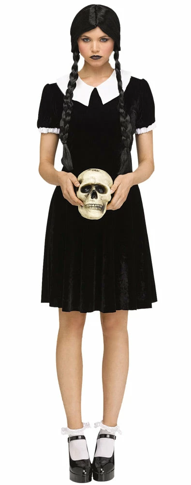 Strikingly spooky dress for you to use to create your own special character! Black dress with white collar. Wig, skull, socks, and shoes not included.