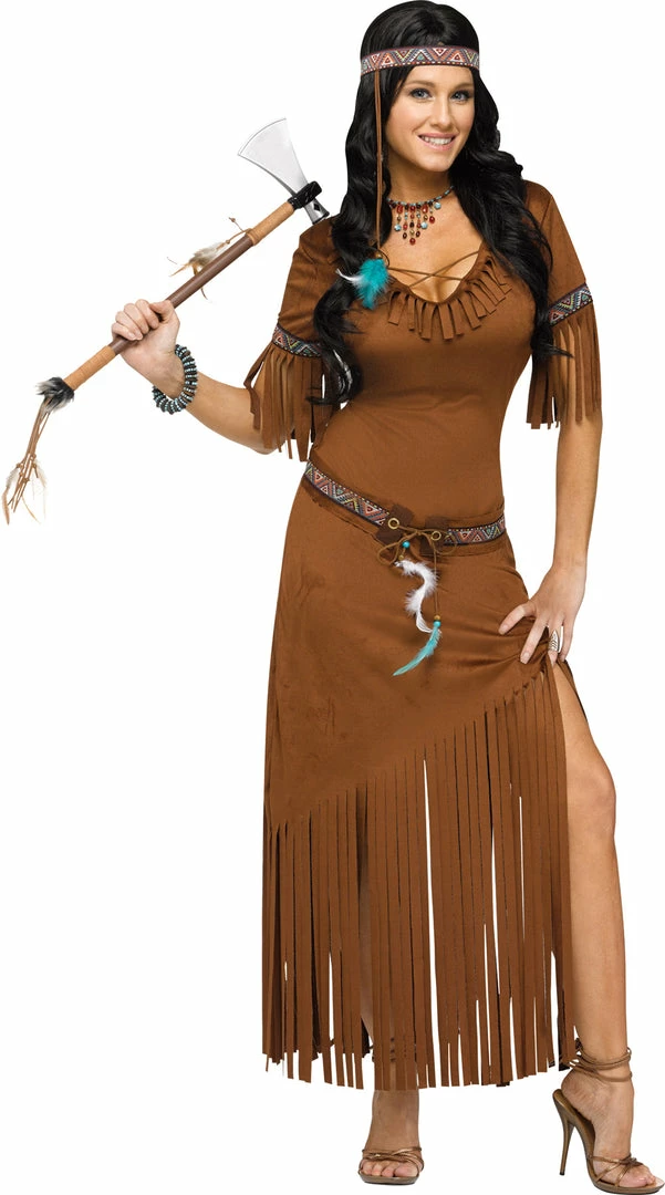 A simple, beautiful, eye-catching dress! Move over Pocahontas! Suede-look dress has colorful ribbon trim and fringed neckline, sleeves, and interesting high/low hemline. Matching tie-on belt with bead-look trim has feather and bead accents and includes headband with a dangling feather and bead trim. Shoes, jewelry, and tomahawk are not included.