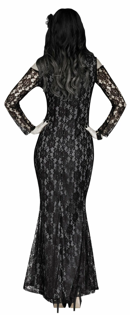 Looking for a woman’s Halloween costume that is beautiful and doesn’t show too much? This elegant skeleton dress is a perfect choice! The floor length cold-shoulder dress is made from a sheer black lace with gray underlay and features a white skeleton print on the front. Add your own skeleton makeup to complete the look.