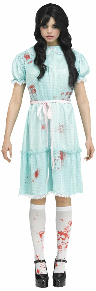 Become your true twisted self with this new costume which makes it look as if your costume is on backwards! Light blue dress with white polka dot pattern with high neckline and reverse look apron with blood-spatter markings on dress, knee highs socks included with blood spatter design. Shoes not included.