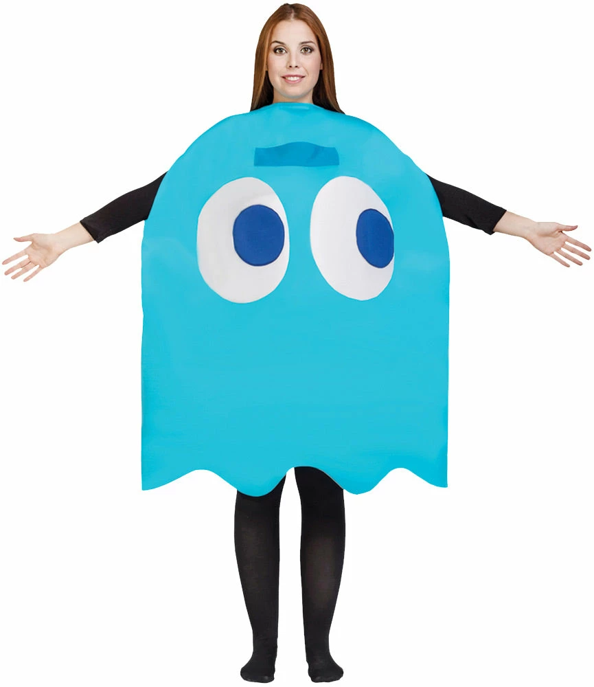 This blue ghost costume from the Pac-Man game includes one individual tunic with two ways to wear it!, One allows you to put your head inside the costume (vision is through a small see-through panel). Or you can put your head though a neck opening and arms through the sleeve openings for a different look. The height of the models are 170 cm, and will fit best if you are between 160-190 cm in height. The loose fit allows one size to fit most adults. 100% polyester.