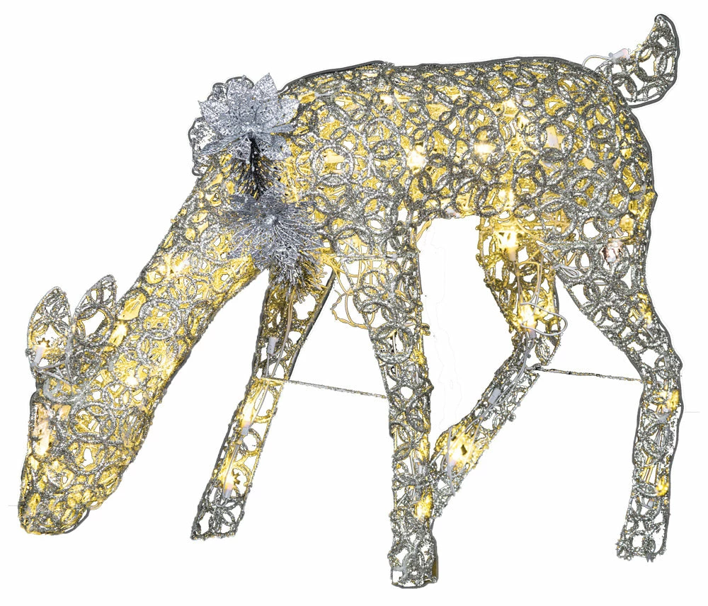 Elegant new yard decor for your Christmas display! Doe with Sparkle Rings with Copper Wire has micro LED lights for a soft glow and a festive wreath around the neck. Classic white LED lights.