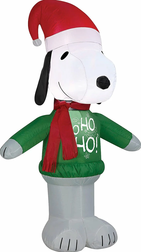 This inflatable Snoopy Airblown allows you to easily create a fun and magical outdoor scene that everyone of all ages will love. A great addition to your outdoor holiday yard décor.This Peanuts Airblown features Snoppy in a green holiday sweater, red scarf and red Santa hat. This Snoopy Airblown lights up, self-inflates in seconds, and deflates for easy storage. Includes lawn stakes and tethers for quick and easy setup. Batteries not required. No additional parts required. No assembly required: plug it in, stake it down and the magic unfolds! Provides maximum impact with minimum effort!