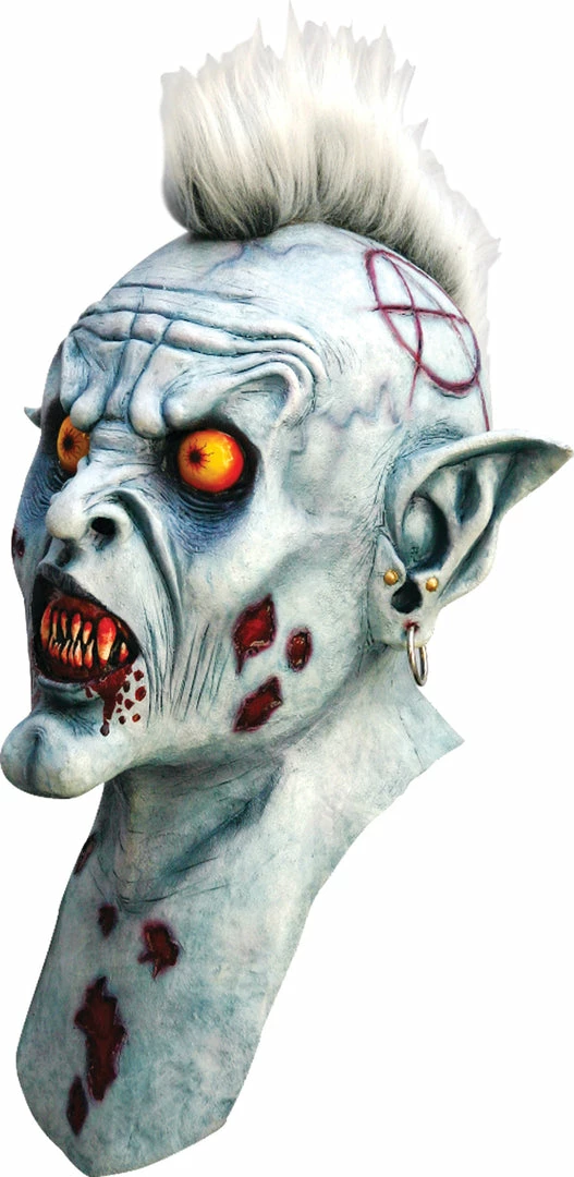 Super detailed, full over the head mask, individually hand painted for the most realistic look possible. Alien looking pale face with pointed ears and decayed areas on cheeks and neck. Has bloody fangs and red eyes, with a shock of white hair just on top.