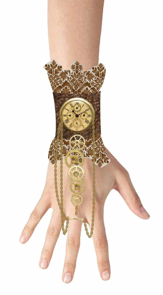A great accessory for your steampunk costume! Lace wristlet has authentic-looking old fashioned clock decal with gear charms and hand chain that fits on your finger. One size fits most.