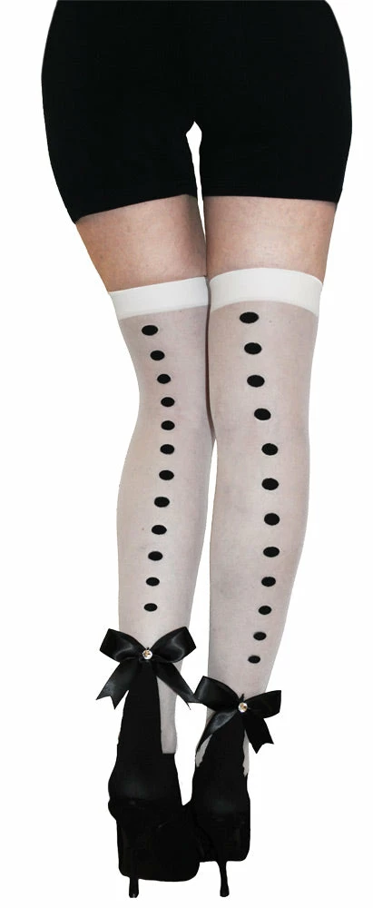 Looking for some cute thigh highs to complete your Halloween costume? These dainty thigh highs are the way to go! Sheer tights with button accent. One size fits most adults.