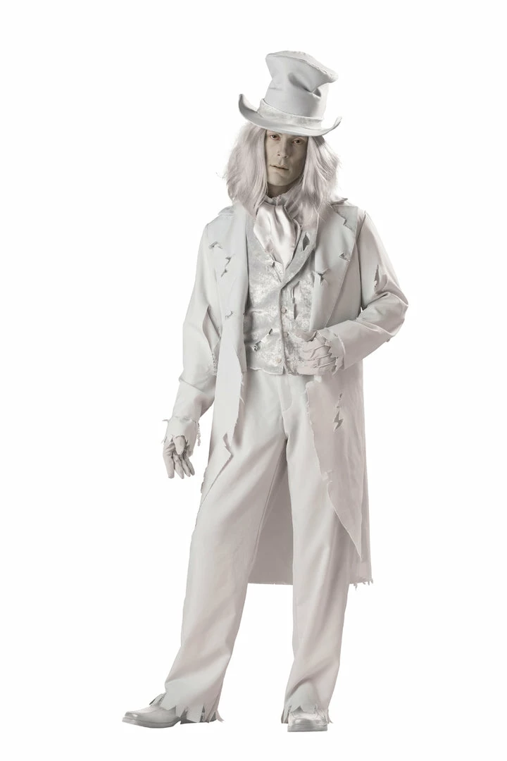 Coat, vest with attached shirt sleeves, pants, dickie with scarf collarand hat tattered for aged effect plus gloves and wig.