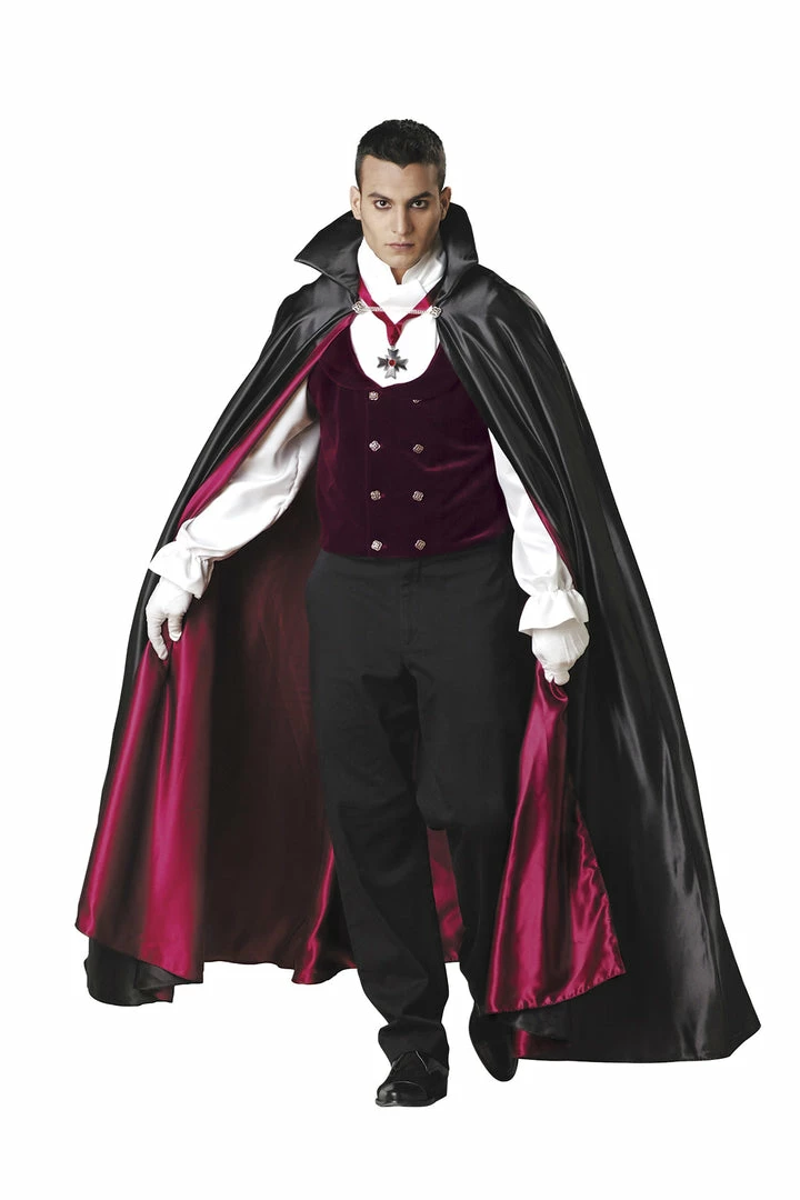 Velvet vest with attached shirt sleeves and scarf collar, full length lined satin cape, white gloves and medallion on ribbon.