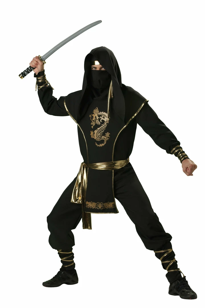 Shirt and pants with gold ties on cuffs, hooded tunic with gold dragon emblem, face mask headband, and waist sash. Sword not included.