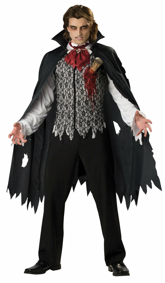 Tattered cape, layered vest/shirt combo, ascot, and realistic vinyl stake sticks out of costume. Simply add your own black pants.