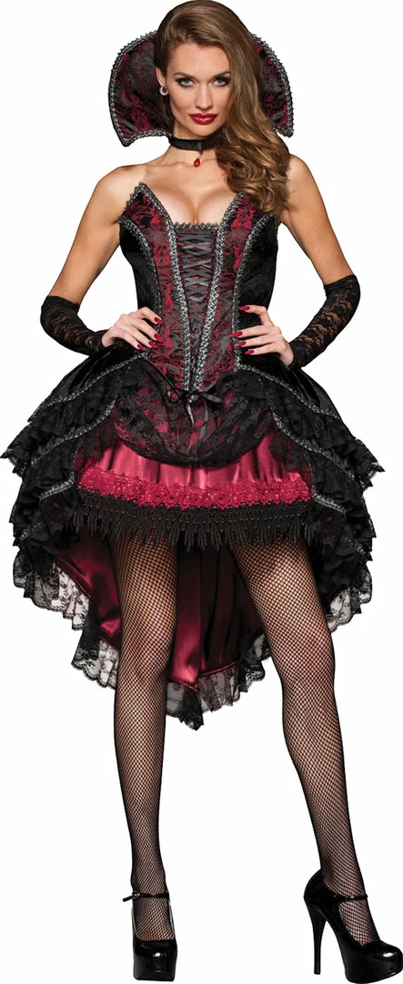 Brocade dress with corset-like boning, lace-up front, black lace and silver trim accents, lace trimmed petticoat, stand up collar with jewel pendant and black lace gloves. Shoes and stockings not included.