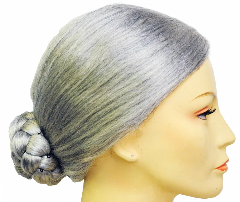 Center part wig has the hair pulled back into a low braided bun. BudgetÂ