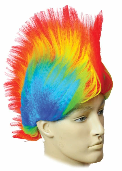 Brightly colored wig with interesting look for clowns! Colors spread out in a sideways fan or mohawk. Unique! RAINBOW