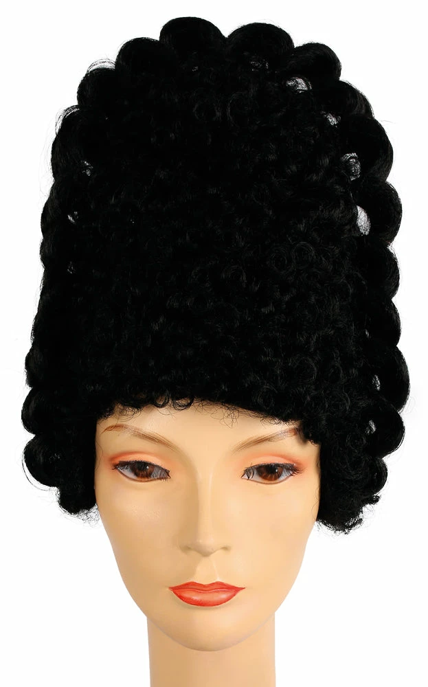 Tall wig with tiny stiff curls has rows of tuck and roll curls on each side.