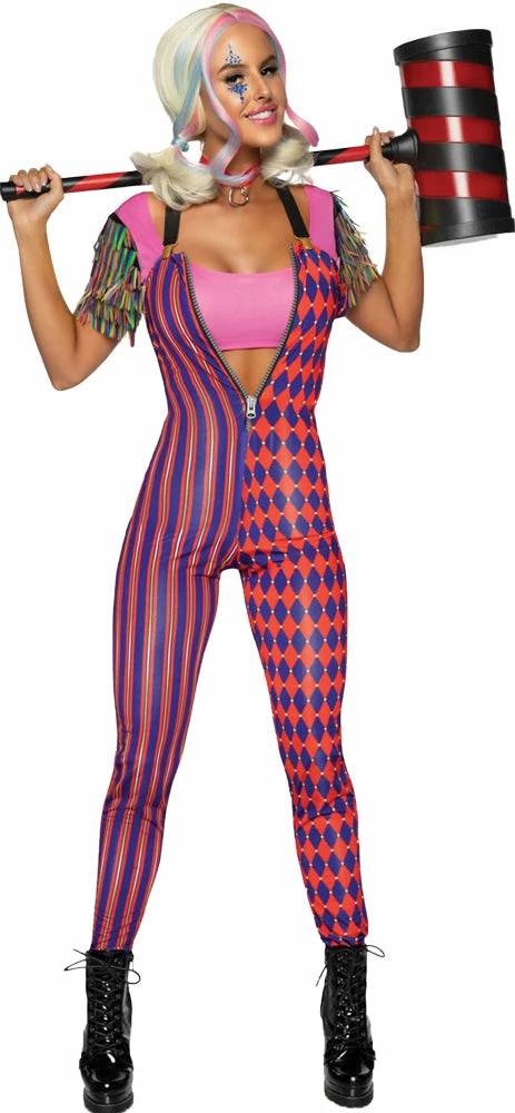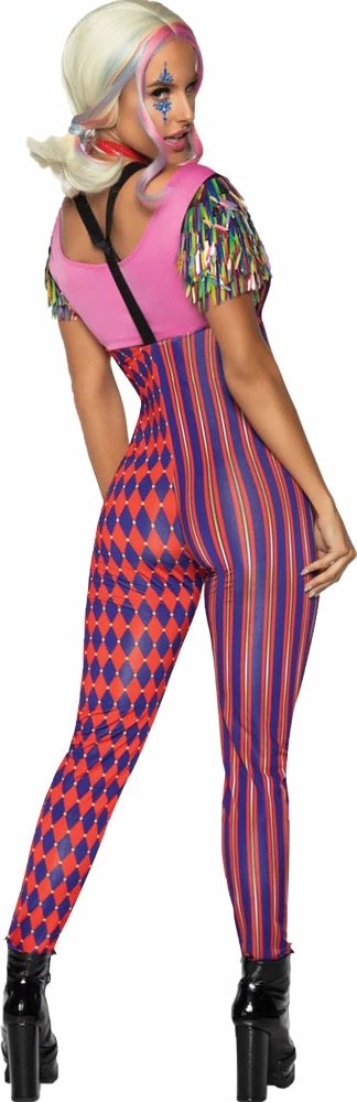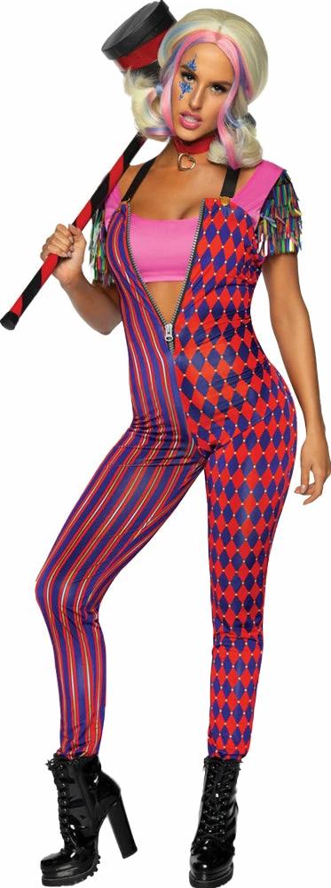 3 PC Comic Vixen, includes zip up jumpsuit with suspender straps, confetti crop top, and heart choker.