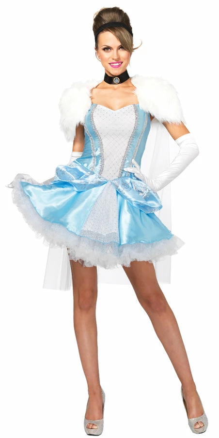 Lovely sassy version of your favorite fairytale love story! Blue dress with silver lurex diamond print inset panel and glitter carriage skirt detail detachable fur capelet black velvet choker and black velvet headband. Gloves are not included.