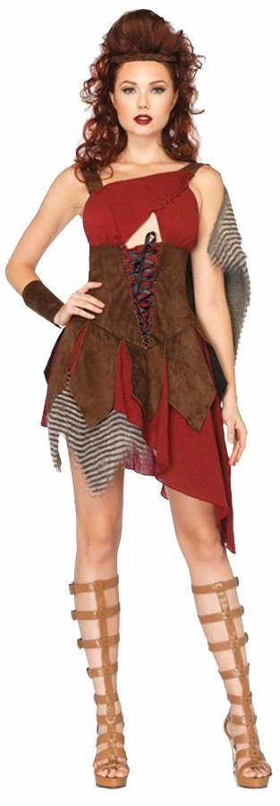 Brown cut-out dress with faux suede waist cincher and fur pelt accents wrist cuffs and matching head piece.