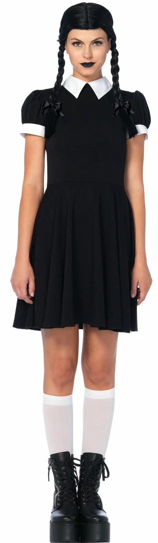 Perfect simple gothic look for your next haunted gathering! Fit and flare back-zip black dress has a snow white collar and puffed sleeves with white trim. Also comes with a matching black braided wig with black satin bows! Just add your own shoes and socks or maybe a headless doll for fun!