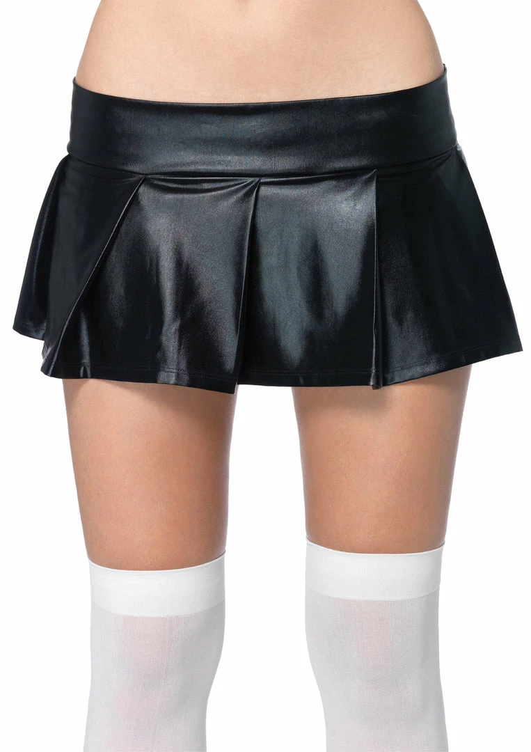 Sexy black wet-look pleated skirt. Hands wash drip dry do not bleach do not iron.