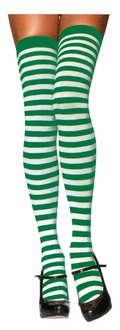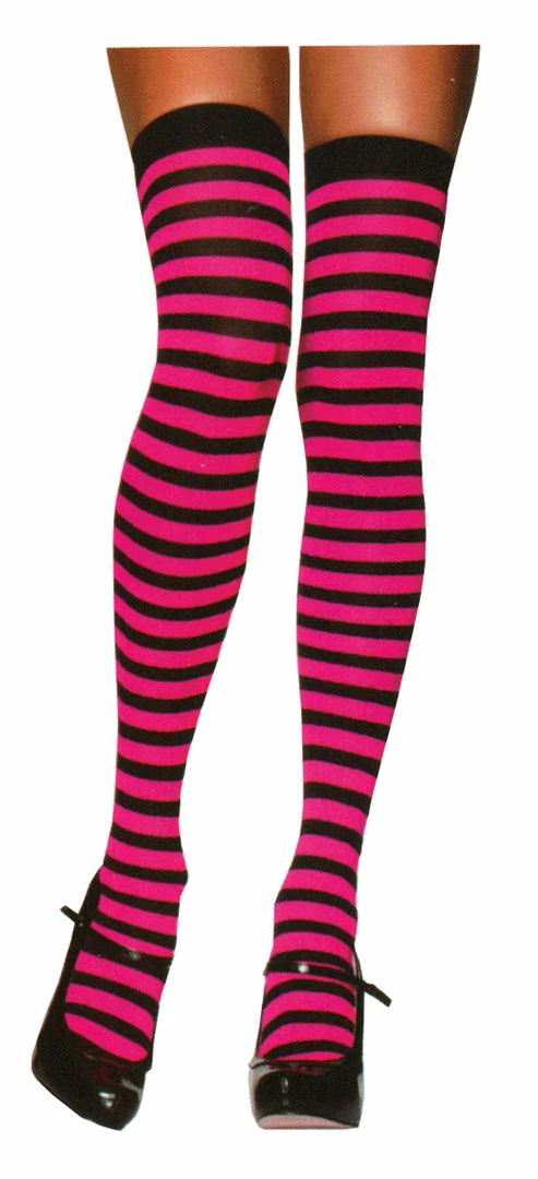 Black opaque nylon thigh high stockings with horizontal opaque stripes. One size fits most.