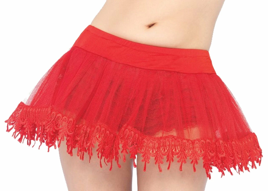 16-inch petticoat trimmed in teardrop lace has elastic waist. Nylon. One size fits most.