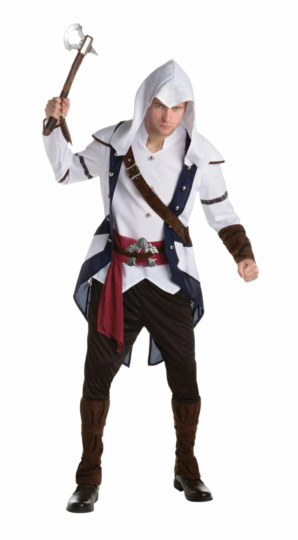 You can now dress up like your favorite character Connor from the award-winning video game Assassins Creed! Hooded tunic with attached cape, sash belt with buckle, and pants with boot covers. 100% polyester. Do not wash. DO not bleach. Do not dryclean. Do not iron. Weapon is not included.