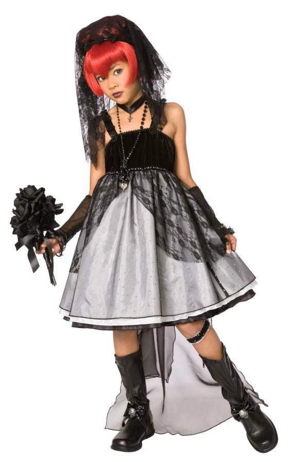 Dress with lace overlay, arm gauntlets, garter, choker, and dark lace veil. Bouquet not included. Try our FW8117BK Rose of Darkness