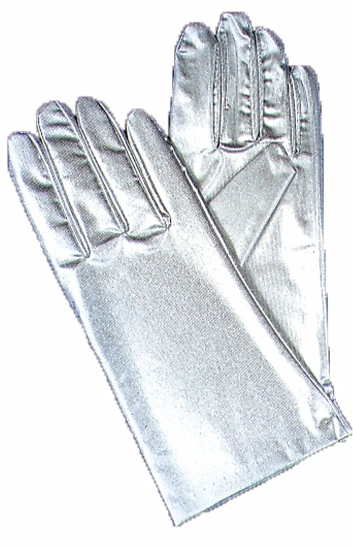 Wrist length metallic stretch nylon gloves.