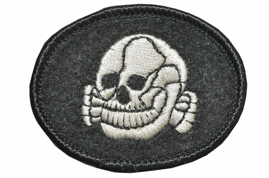 Sew-on black patch with white skull and cross bones for a, inches inchesGestapo inches inches officer.