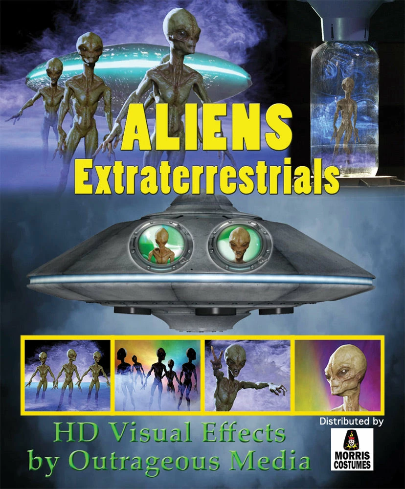 ALIENS Extraterrestrials Digital Decor gives Halloween decorators an ET Alien-themed effects series for that other-worldly look. While projecting on a screen covering your front window it will appear that Aliens are walking in your house and looking out the window. Multiple Aliens walk in fog or peer at you with a UFO in the background. They even fly IN a UFO! There are scenes with Aliens in Area 51 containment chambers and standing in high tech spacecraft interiors. There are very wide view scenes and close up scenes–Varieties designed to fit all window sizes including even large movie screens! Contains 25 total effects including select vertical scenes [flipped sideways] for thin windows and a couple of bonus Christmas Themed Alien effects!