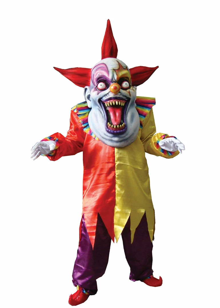 Colorful creepy clown suit includes tunic pants and collar with oversized mask and hands. One size fits most adults.