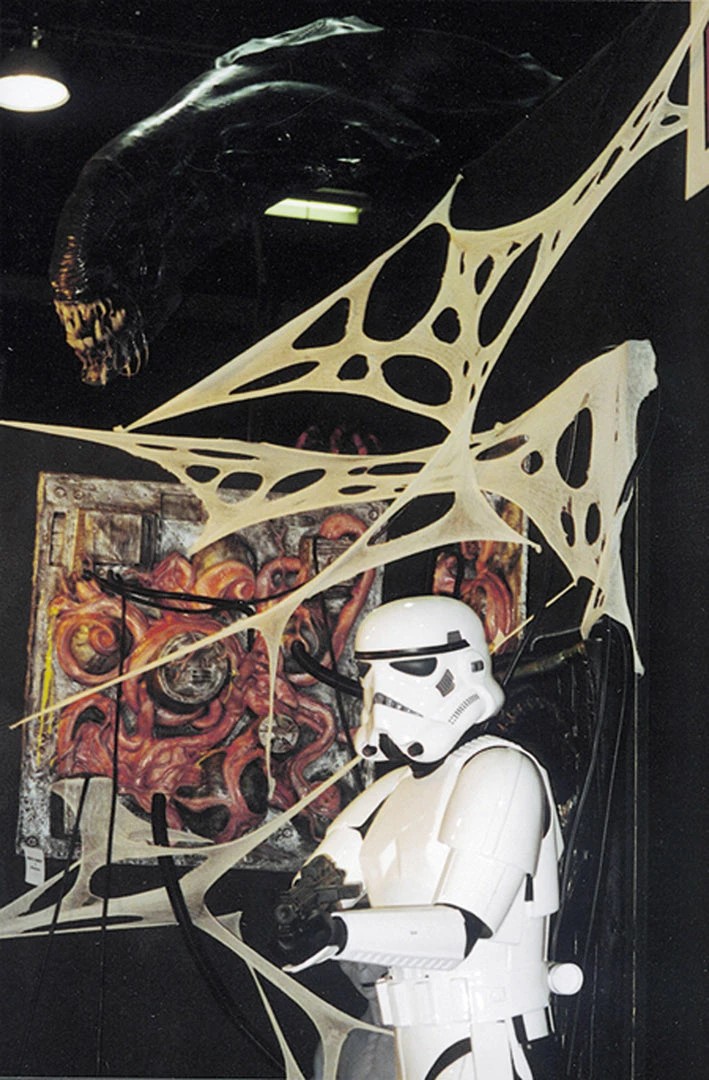White poly-cotton blend cloth that once stretched between two points creates a strange eerie effect. Simply split the material in spots stretch and you have the most gruesome Haunted House atmosphere. Sold by the yard.