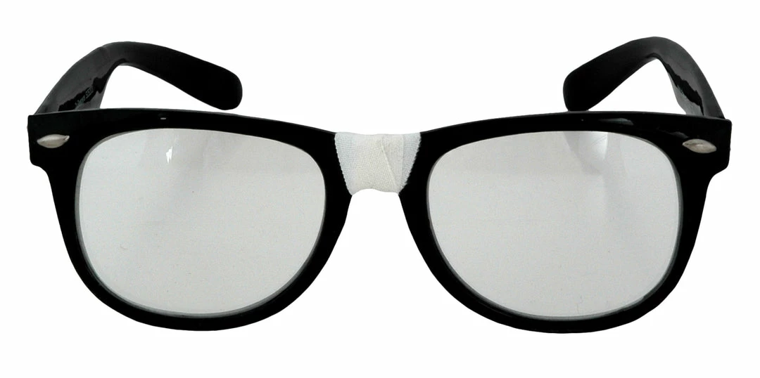 A perfect accessory for your nerd outfit! Heavy black frames with some first-aid tape around the nose piece. Great fifties look! Plastic frames and hinges. One size fit ages 12 and up.