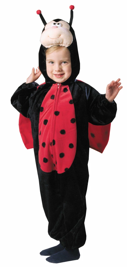 Fuzzy polyester jumpsuit with plush ladybug head sitting on, top of attached hood and wings on the back. Features, zipper front and elastic cuffs. Fits most children size 1, to 2.
