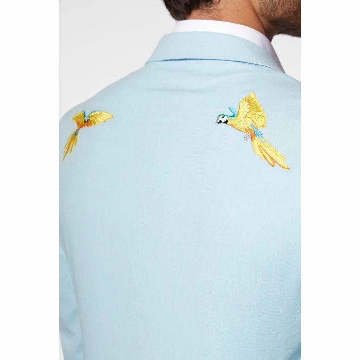 A bird in your chest pocket is worth two in the bush. Spring and summer are the seasons to show your vivid style choices. This soft blue blazer is made of a breezy, high-quality cotton-linen blend and therefore perfect to keep you cool while maintaining a sharp look. Topped off with eye-catching embroidered parrots and a palm leaves lining, this jacket has it all: fun, luxury and style.