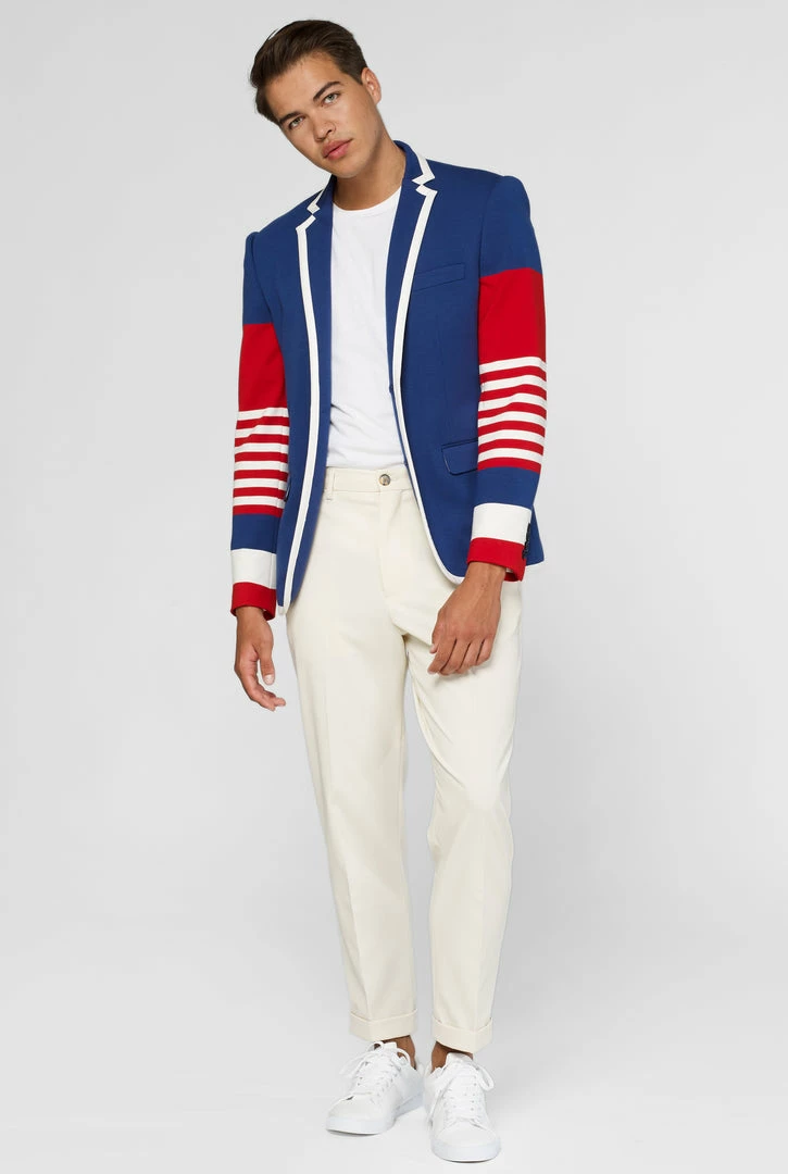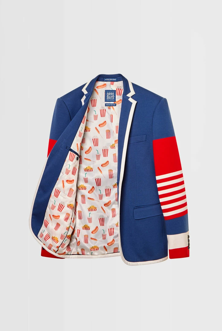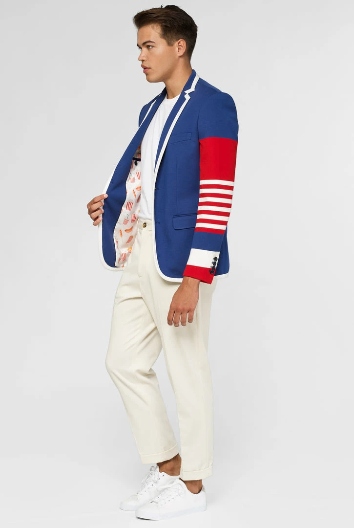 Embracing your inner patriot and still looking your best: that’s what Dandy Fan is about. This red, white and blue OppoSuits Deluxe blazer has a stylish cotton tape trim, a game day food lining and is made of a comfortable and delicate double-knit jersey. It lets you win the ‘best-dressed supporter trophy’ at any sports event.