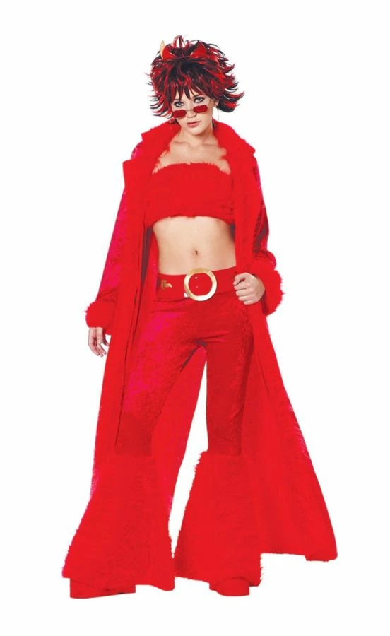 Fur tube top velvet pants with fur bell-bottoms belt velvet coat with fur accents and devil horn headpiece.