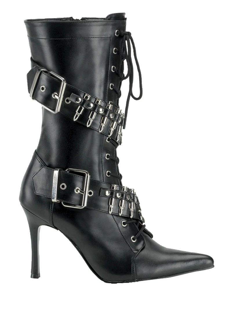 Black boot with lace-up front, buckle accents and bandolier bullet belt detailing.