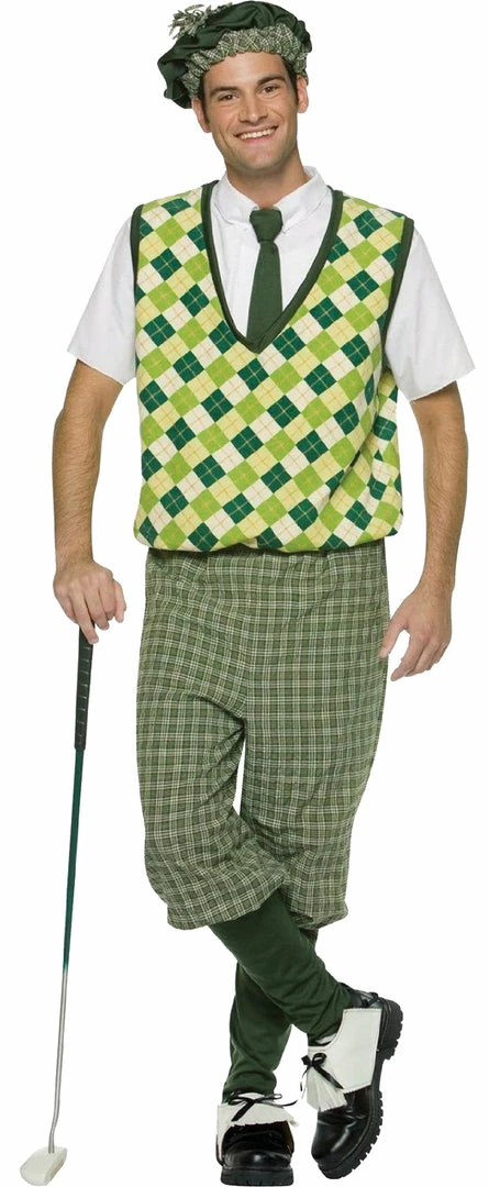 This Old Timey Golfer Costume will be a hole-in-one at the Halloween party or golf course. Costume includes sweater shirt with tie, knickers, sock/shoe covers, and beret. Just add your own golf club! One size fits most adults.