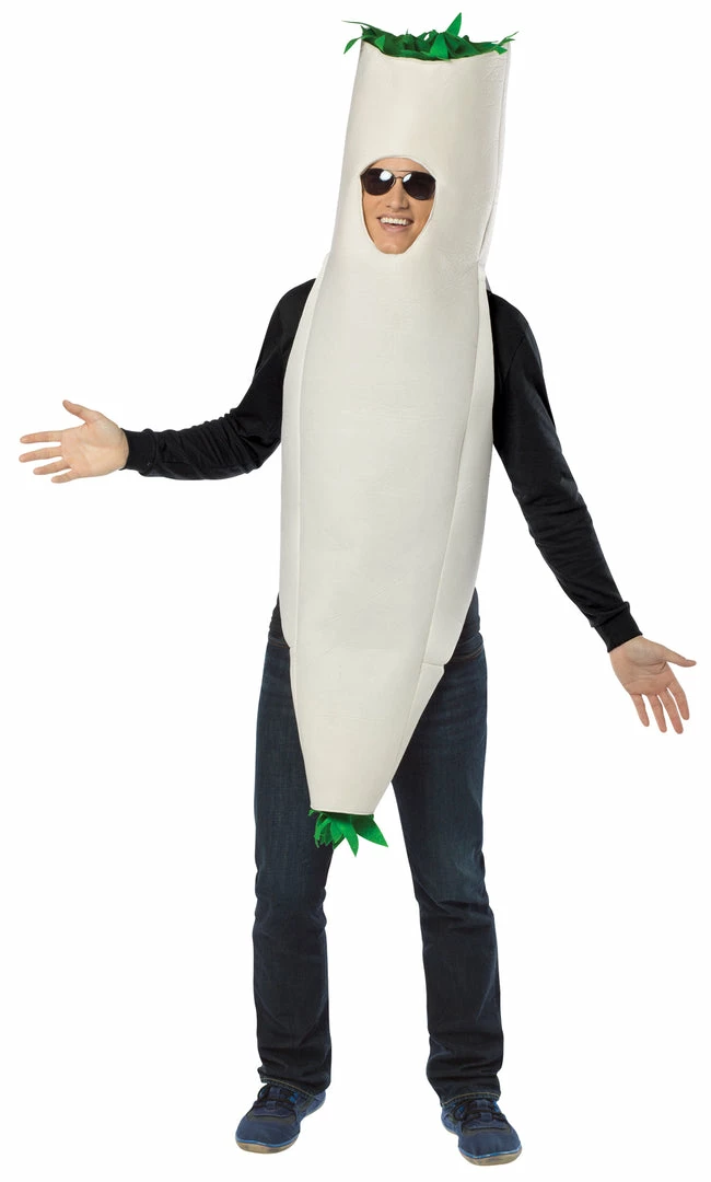 Marijuana, once illegal, is now becoming a staple across the United States. This funny original Spliff costume is perfect now to promote Pot use, or wear to the State House as you campaign for legalization. Wear it to your next adult party and relax! Foam-backed fabric tunic with a bit of green leaf showing at either end for a realistic effect. Just wear your own shirt and pants! One size fits most adults.
