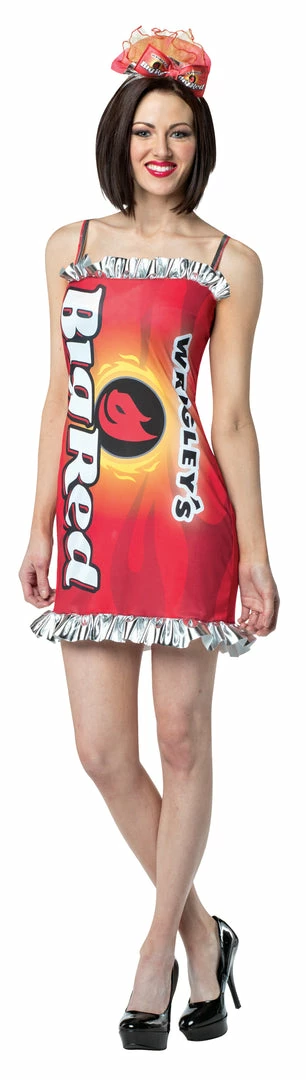 Look hot on Halloween with this Wrigley’s Big Red dress! Mini dress is made from 100% polyester and features spaghetti straps and silver foil-inspired ruffles on top and bottom. This funny women’s costume also includes the headband with bow and tulle detail. Adult Standard, fits women sizes 4-10.